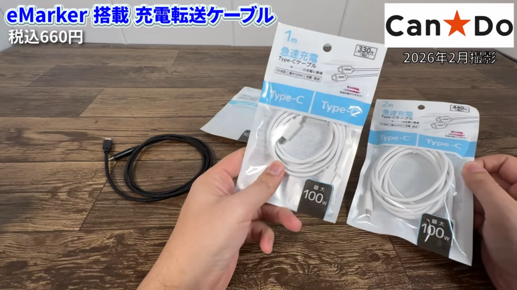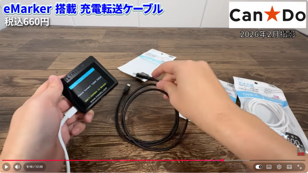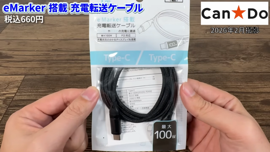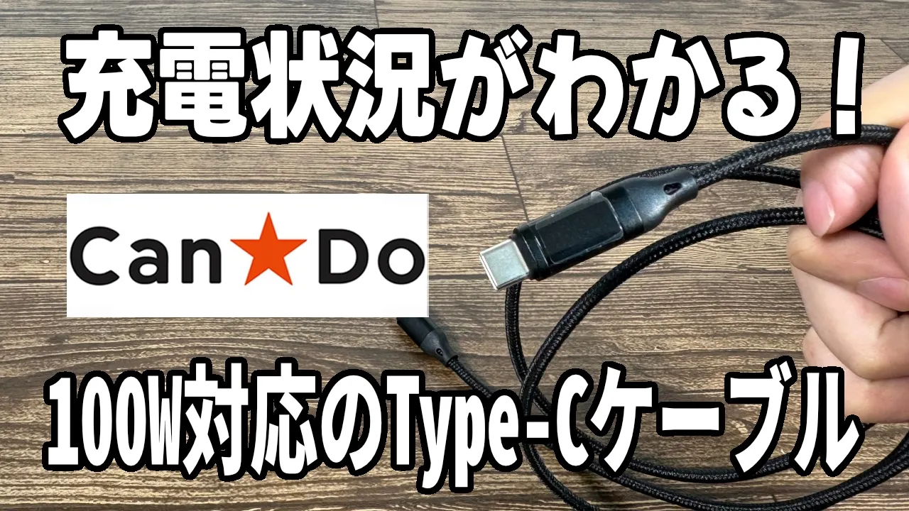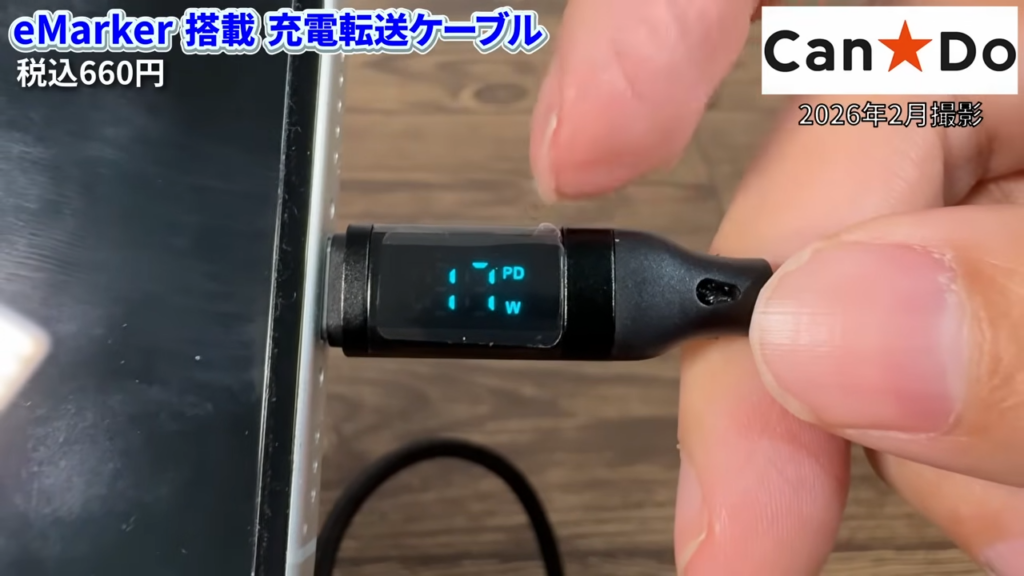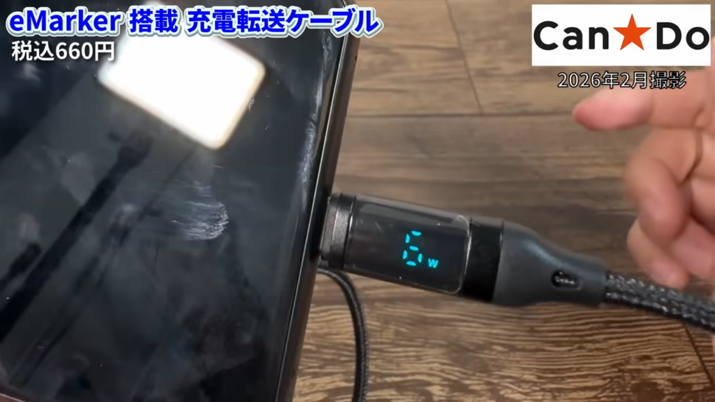 CanDo(キャンドゥ)で見つけた「Eマーカー搭載 充電転送ケーブル(660円)」を実際に使ってみたところ、ディスプレイで現在のワット数を確認でき、日々の充電管理においてしっかり使える商品でした。