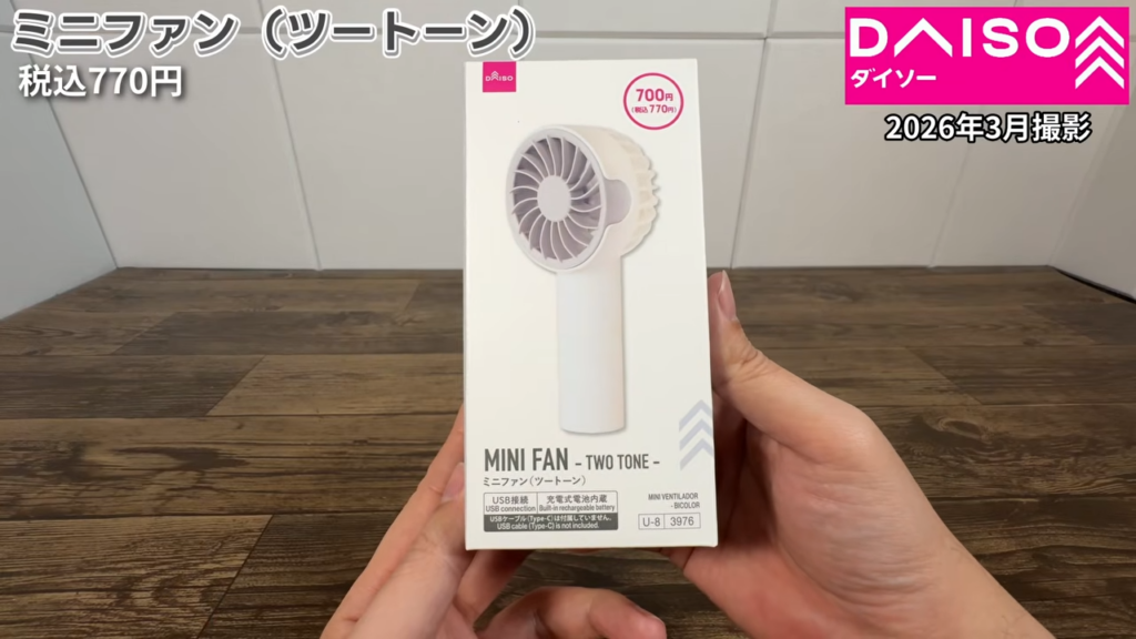 DAISO(ダイソー)で見つけた「ミニファン(ツートーン) 税込770円」を詳しくレビューします。くすみカラーの落ち着いたデザインだけでなく、3段階の風量調整など実用的な機能性を兼ね備えた、今季大注目のハンディファンでした。