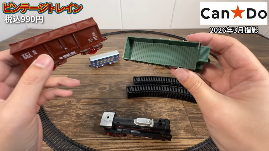 キャンドゥのビンテージトレイン客車タイプ(880円)は、機関車と客車がセットになったレール付きのおもちゃです。