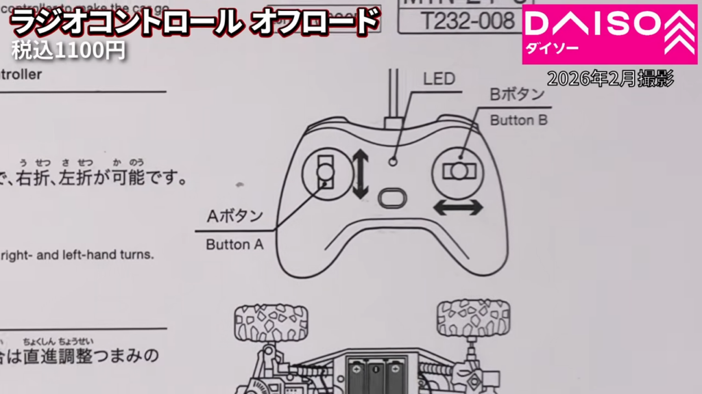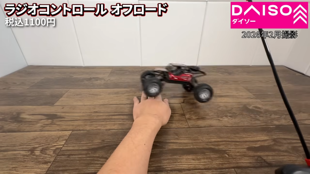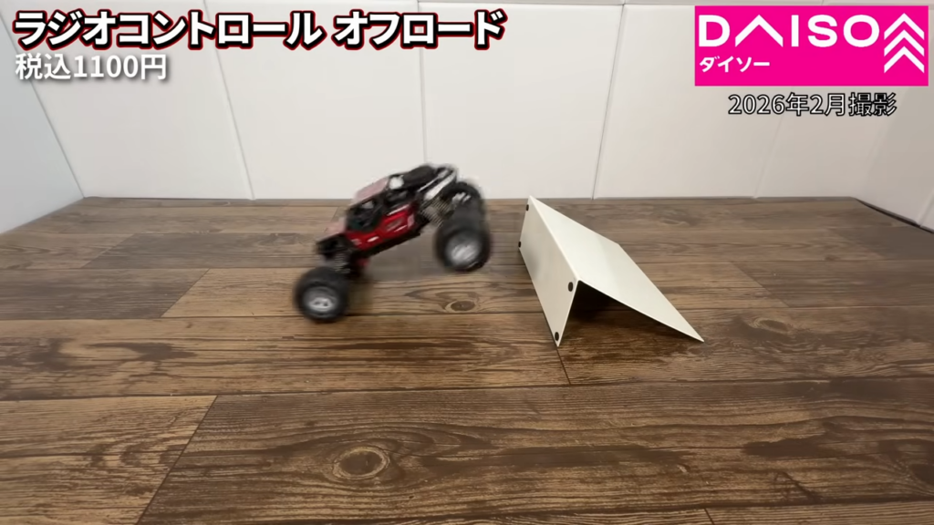 ダイソーのラジオコントロールオフロードカー1100円を購入して動かしてみました。タイヤが大きいオフロードタイプのラジコンで、室内での走行や段差の乗り越えなどを試してみました。