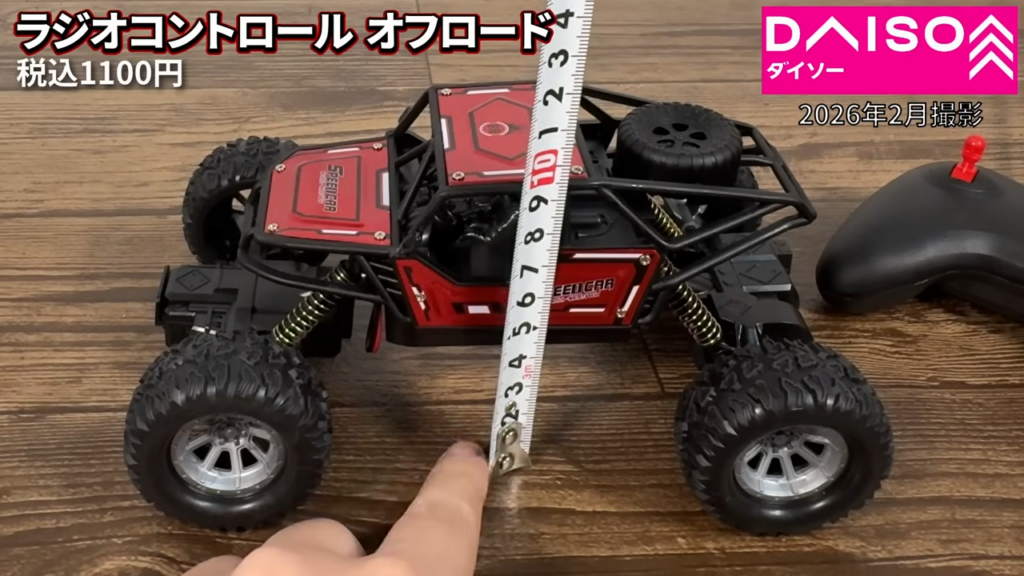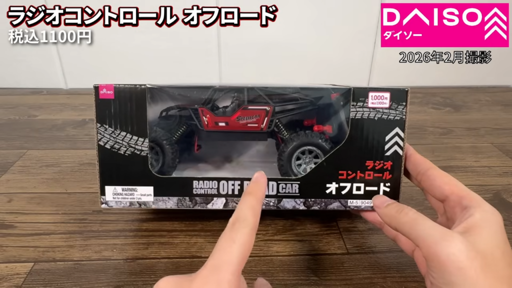 ダイソーで販売されていたラジコンカー「ラジオコントロール オフロード」。価格は1100円で、オフロード仕様のタイヤを装備したモデルです。
