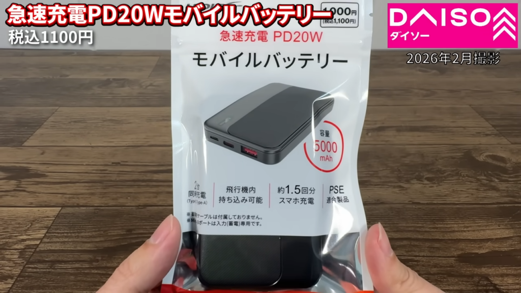 ダイソーで販売されていたPD20W対応のモバイルバッテリー。価格は1100円で、容量は5000mAhです。
