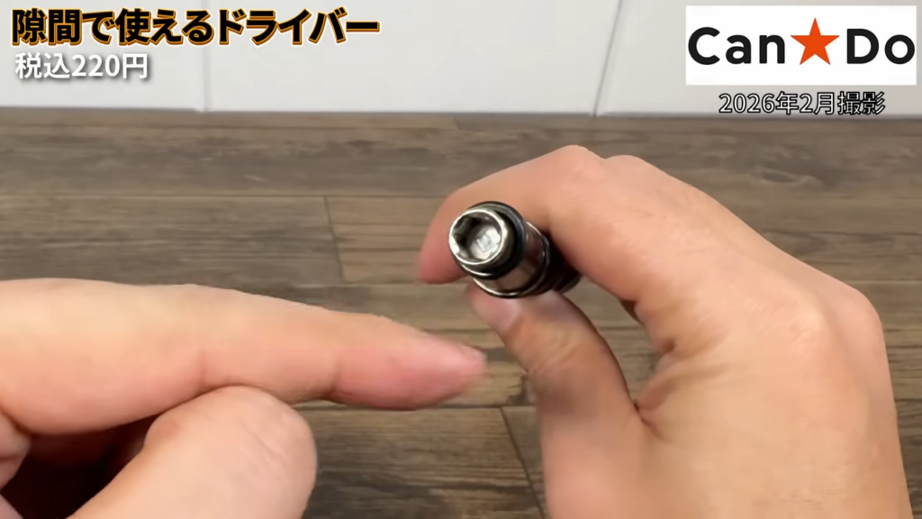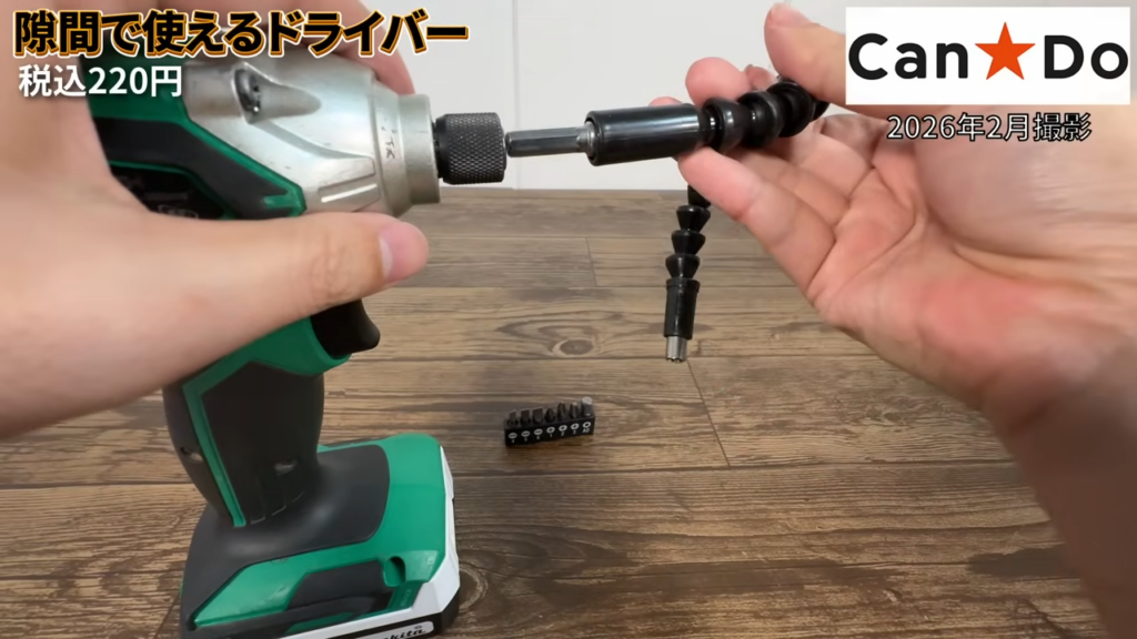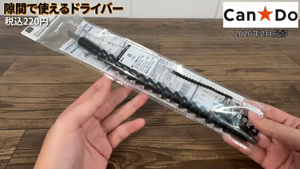 普通のドライバーでは入りにくい場所のネジを回したいときに、こういったフレキシブルタイプの工具があると便利です。220円でビットもセットになっているので、DIYや簡単な作業用に工具箱に入れておくのも良さそうなアイテムでした。
