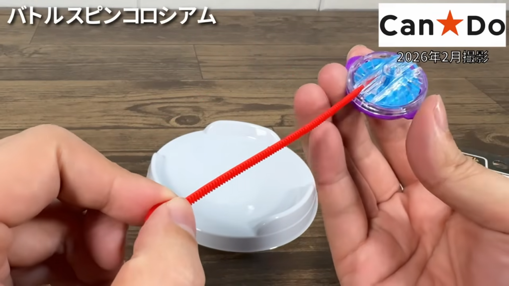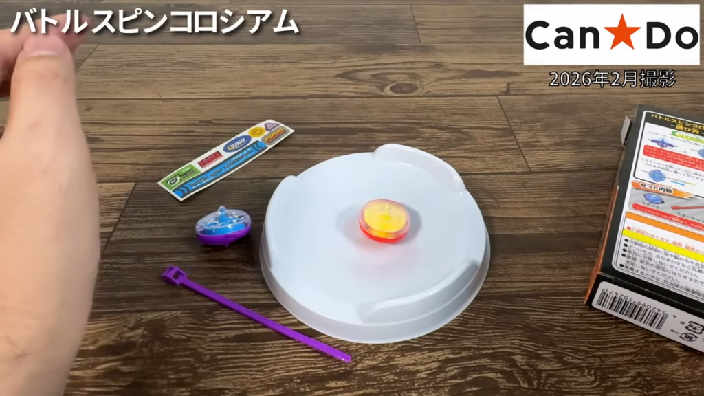 スタジアムの直径は約11cm、コマの直径は約4cmほど。サイズが小さいので本格的なバトルという感じではありませんが、100円のおもちゃとしては十分楽しめそうな内容です。