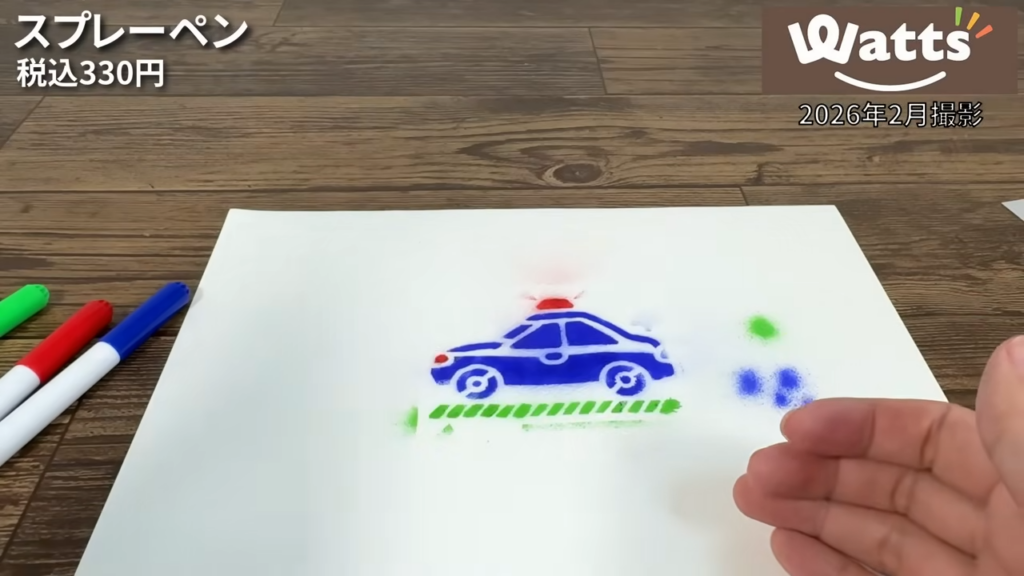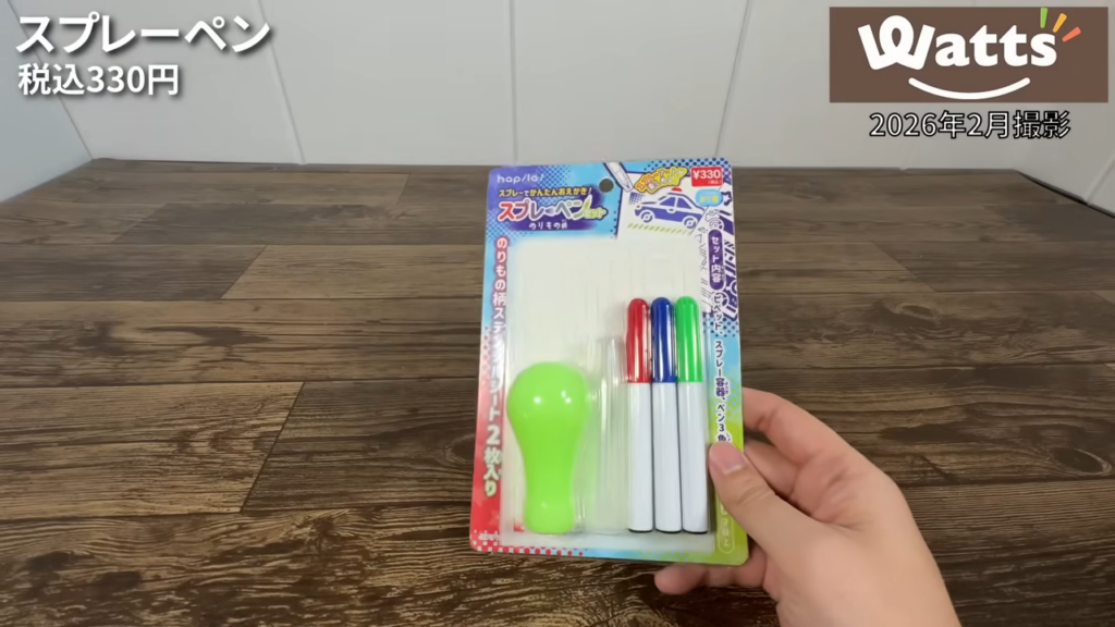 ワッツで販売されていたスプレーペンセット。ステンシルシートとカラーペン、スプレー用の容器がセットになっています。