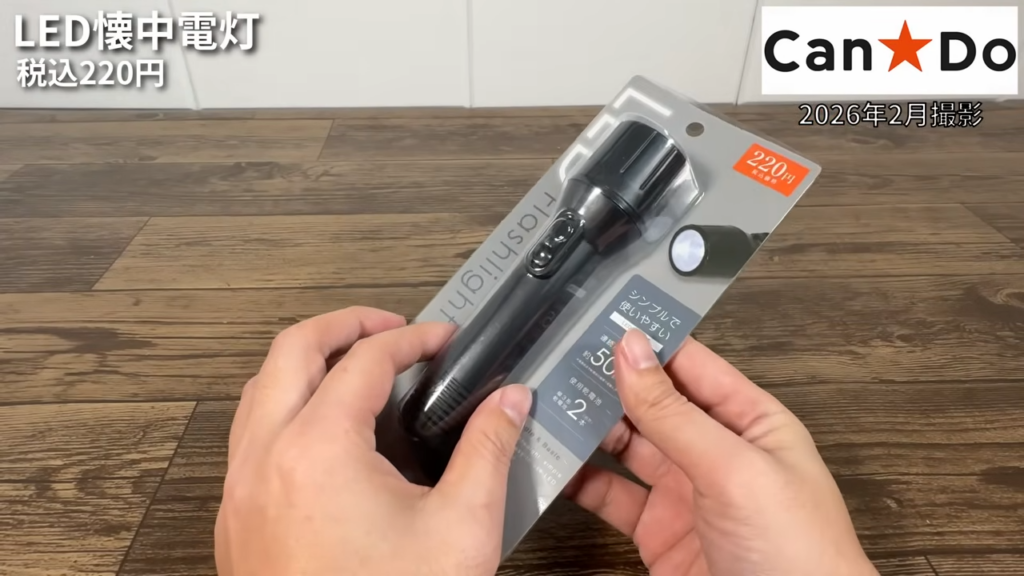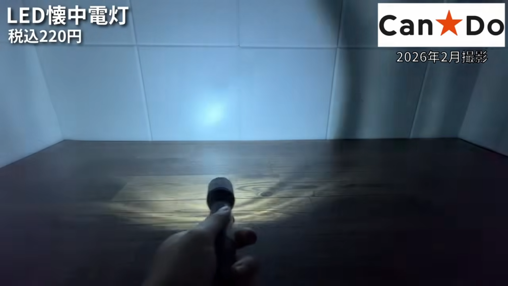 実際の明るさは強力というほどではなく、一般的な100均ライトと大きく変わらない印象でした。シンプルな懐中電灯が必要な時には使えそうです。