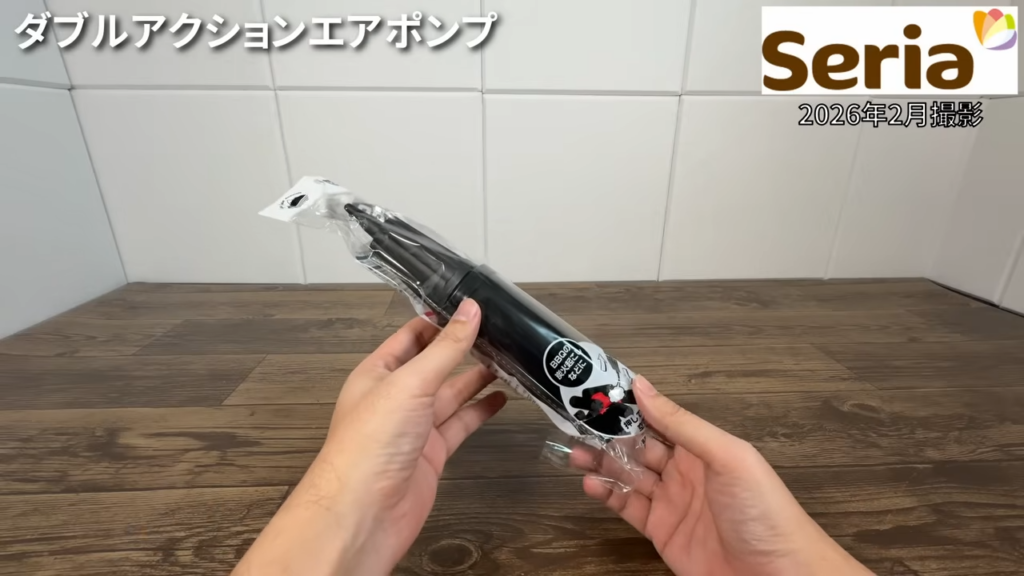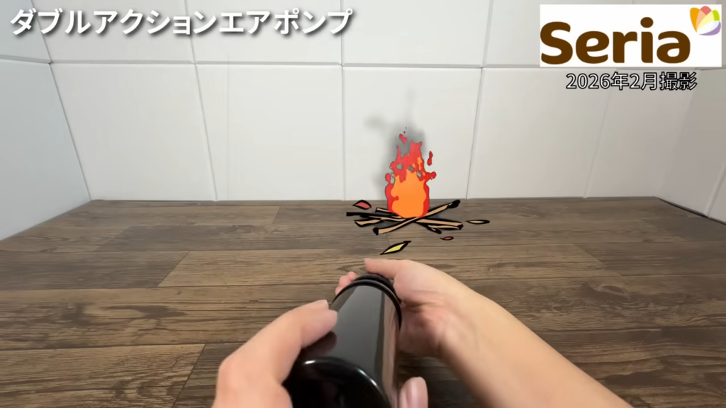 セリアのキャンプ用品コーナーで見つけた火起こし用のエアポンプ。押しても引いても空気が出る「ダブルアクション」タイプになっています。