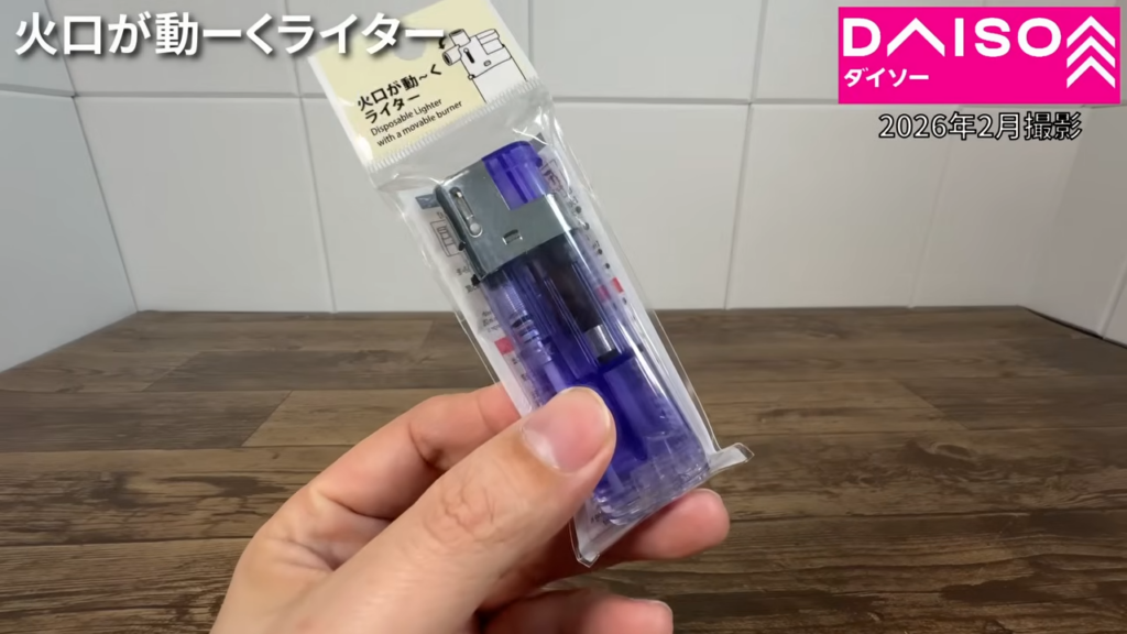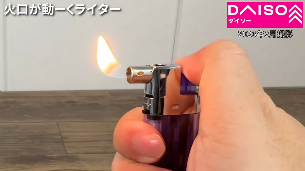 ダイソーで見つけた火口の角度を変えられるライター。一見普通の使い捨てライターですが、先端を動かすことができます。