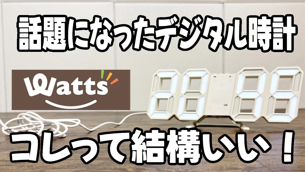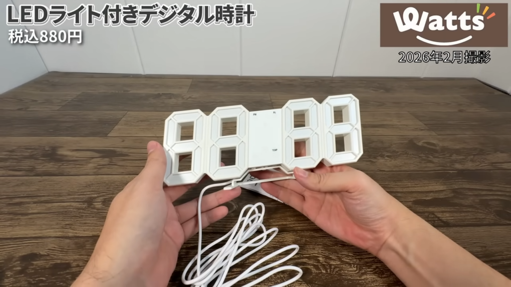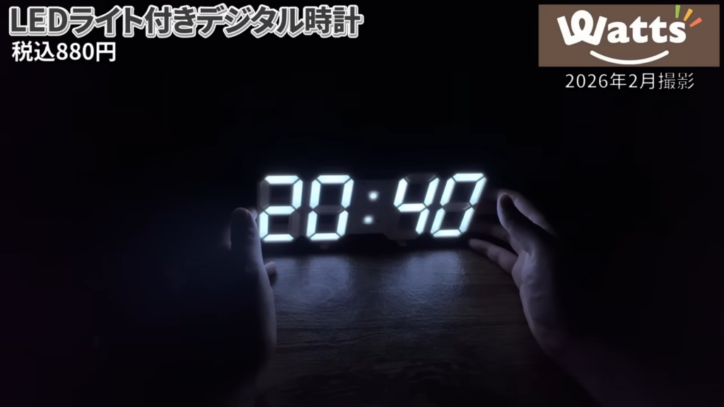 このタイプのLEDデジタル時計は一時期話題になったこともありますが、ワッツでもトキノネブランドとして販売されていました。暗い部屋ではとても見やすいので、寝室や間接照明の部屋に置く時計としてはかなり使いやすいと思います。シンプルなデザインなのでインテリア時計としても使えそうです。