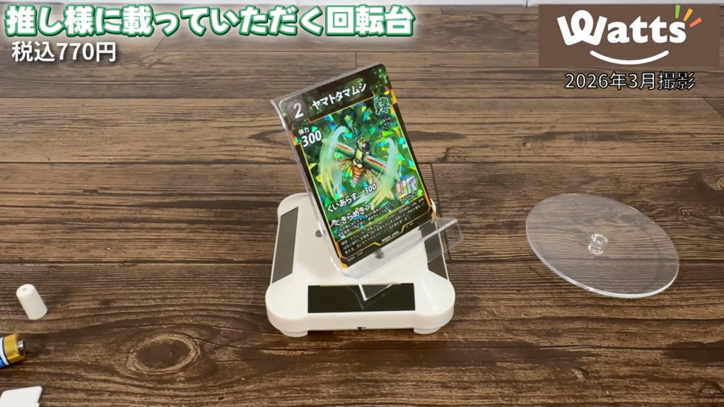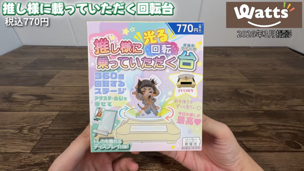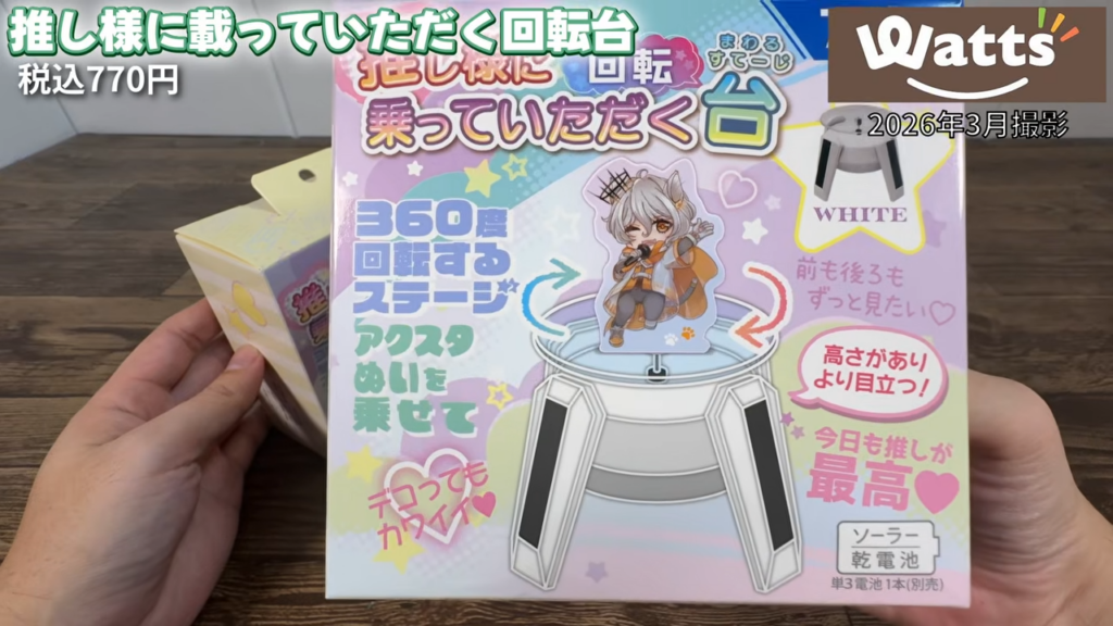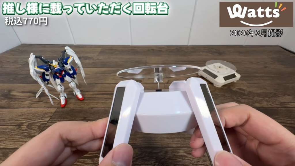 Wattsで販売されていた「推し様に乗っていただく回転台」を試してみたレビューです。ソーラーでも電池でも動く回転ディスプレイ台で、アクスタやフィギュア、トレカなどを回転させて飾ることができます。LED付きタイプと高さのあるタイプの2種類をチェックしてみました。