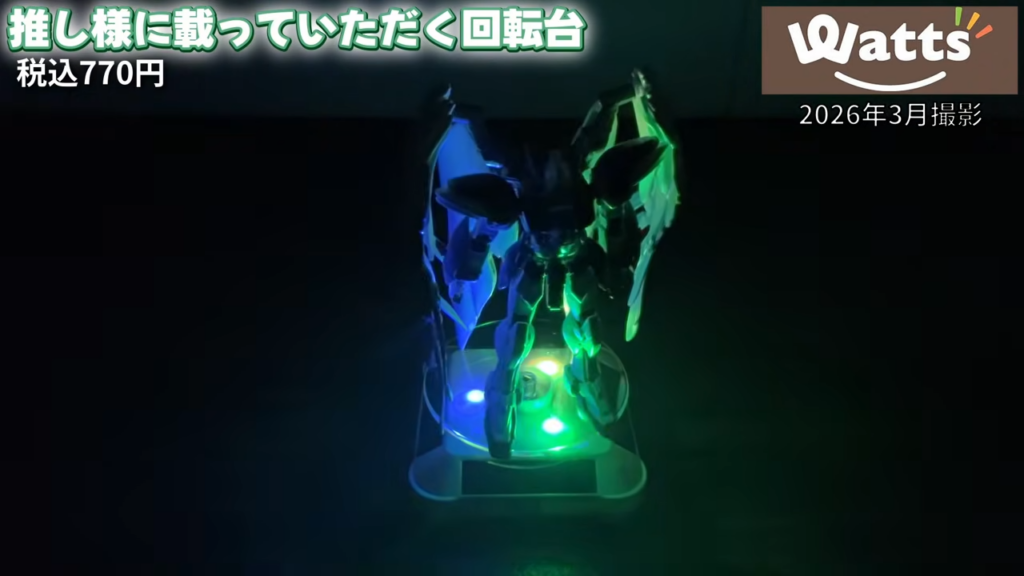 Wattsで販売されていたLED付きの回転ディスプレイ台。ソーラーパネルまたは単三電池で動作するタイプで、上に置いたフィギュアやアクスタをゆっくり回転させて展示できます。